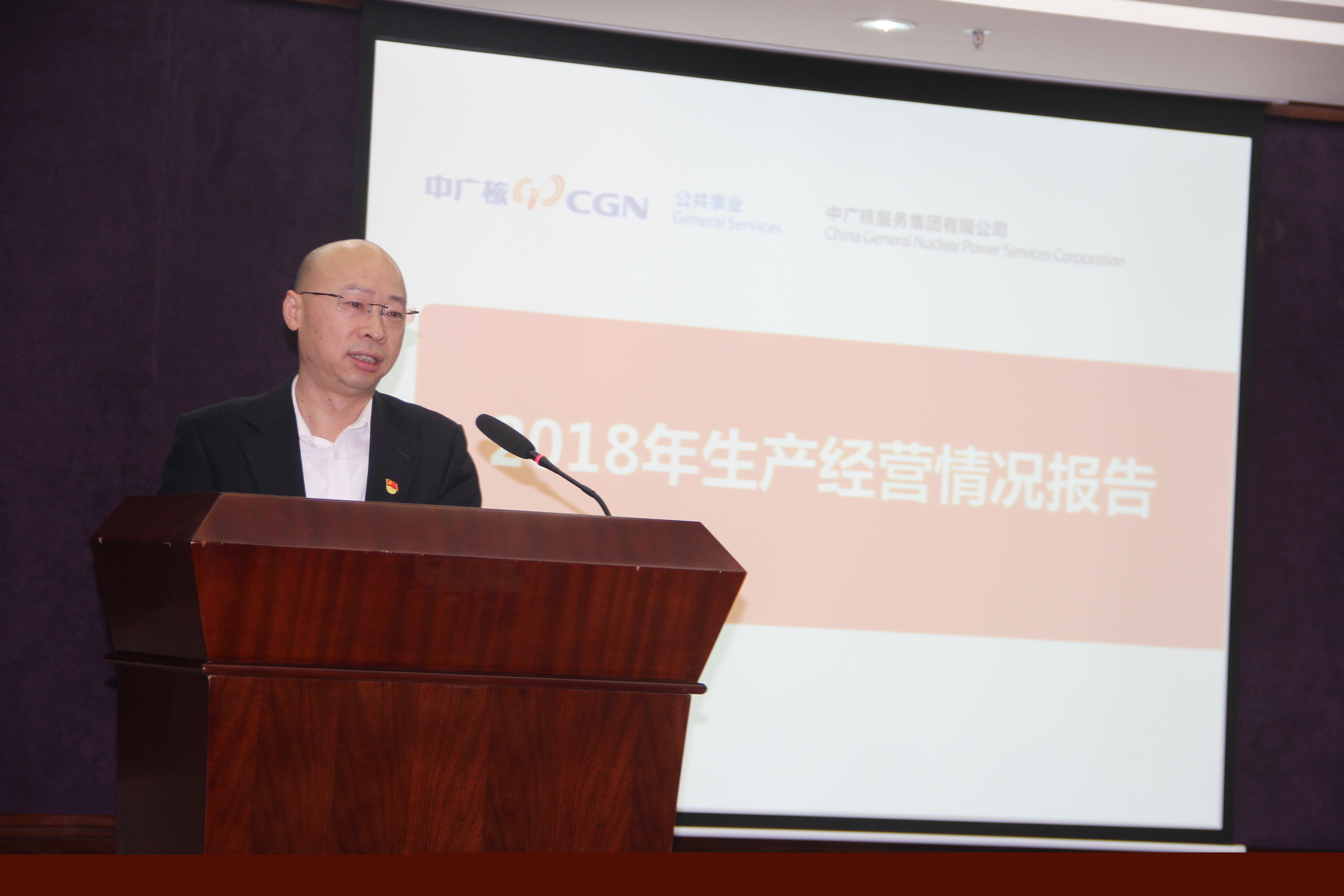 王楚亮代表經營班子向大會作《2018年生產經營情況報告》,匯報了中廣核服、中廣核環保2018年生產經營情況和2019年工作計劃。