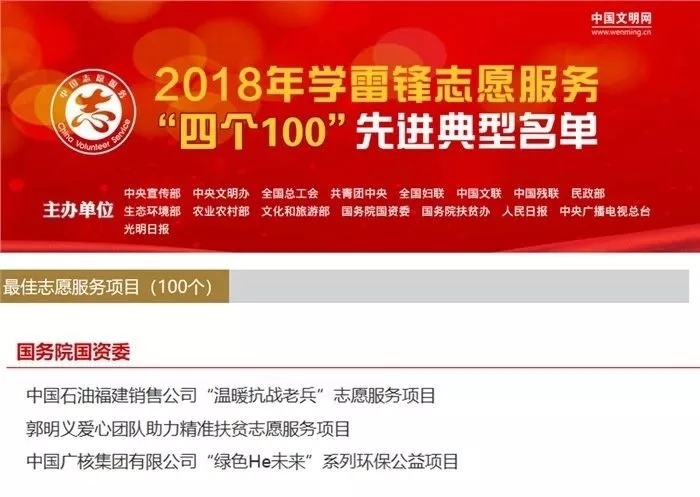 228日,中國文明網公布了2018年全國學雷鋒志愿服務“四個100”先進典型,由中廣核服務集團團委和中廣核工程有限公司團委聯合申報的“綠色He未來”系列環保公益項目榮獲全國2018年學雷鋒志愿服務“四個100”先進典型中的“最佳志愿服務項目”。