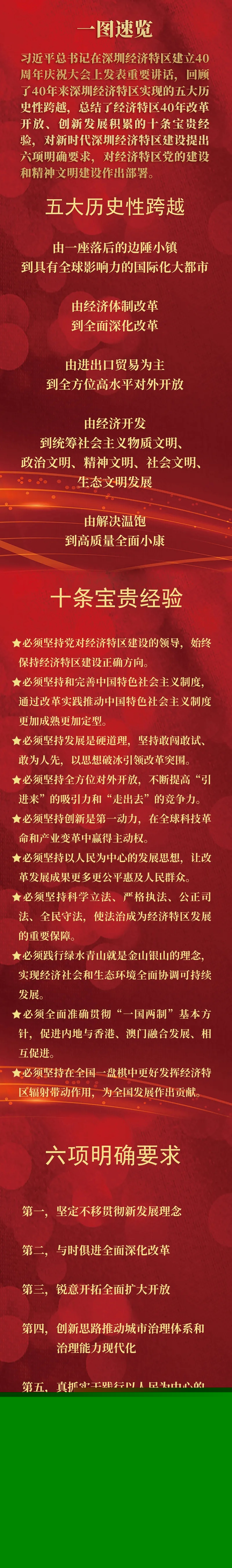 習(xí)近平總書記在深圳經(jīng)濟(jì)特區(qū)建立40周年慶祝大會(huì)上發(fā)表重要講話,回顧了40年來深圳經(jīng)濟(jì)特區(qū)實(shí)現(xiàn)的五大歷史性跨越,總結(jié)了經(jīng)濟(jì)特區(qū)40年改革開放、創(chuàng)新發(fā)展積累的十條寶貴經(jīng)驗(yàn),對(duì)新時(shí)代深圳經(jīng)濟(jì)特區(qū)建設(shè)提出六項(xiàng)明確要求,對(duì)經(jīng)濟(jì)特區(qū)黨的建設(shè)和精神文明建設(shè)作出部署。