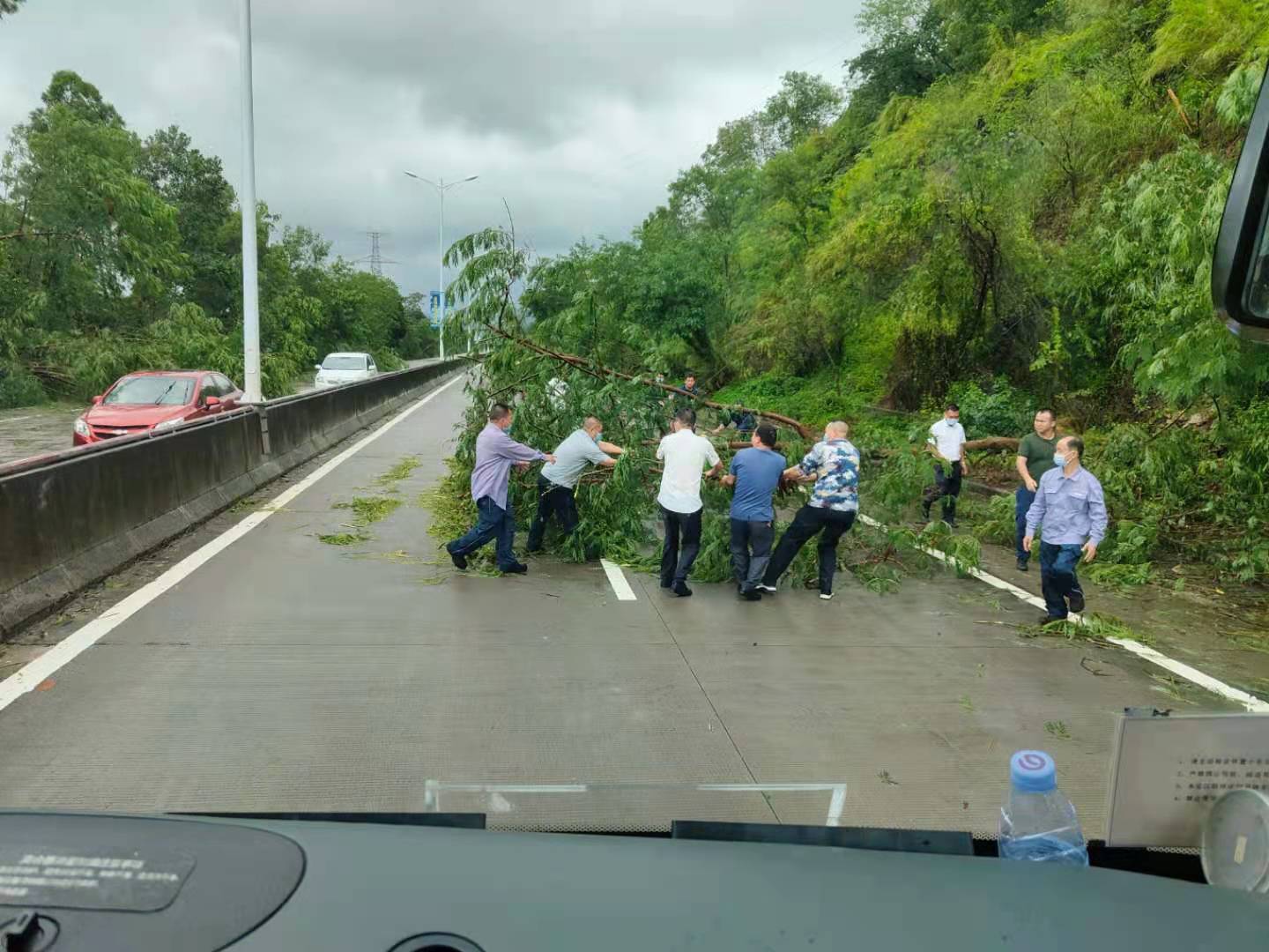行至半路,狂風吹垮的樹干攔住了前進的道路。車上20余名員工商討過后,決定下車將樹枝挪走。路見不平,車上6名中廣核服消防員率先帶頭下車,進行搬運,并結合日常救援技巧,指引其他同事一同發力,不一會兒,道路中間的“攔路虎”就被大家都轉移到路邊。去程50公里的路程,中途停車清理了5次大型的樹枝,掃清了道路障礙,讓周邊生活、工作的群眾可以順利出行。